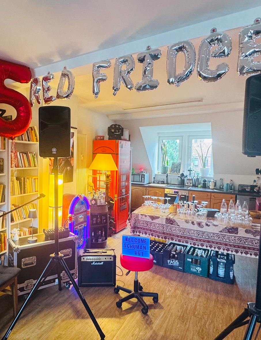 „Wie kommen manche Gigs eigentlich zustande?“, werde ich immer mal wieder gefragt. Ehrliche Antwort: oft auch durch Zufall. Rainer Schumann, Drummer von Fury in the Slaughterhouse, und ich saßen beim Fußball-Derby Hannover 96 gegen Eintracht Braunschweig nebeneinander, sprachen über die Tournee der Furys, dann aber eben auch über sein Soloprojekt Schuman (mit einem n). Und das wollte ich mir mit Red Fridge dann doch nicht entgehen lassen. Rainer, diesmal mit Gitarre und Gesang. Mit dabei: Carsten Litfin an der E-Gitarre.Und was sagt Rainer selbst über seine Musik? „Mal flächig verspielt, gerne auch handfest…aber immer so wie es die Songs grad brauchen. Ja, die Songs sind das Wichtigste: Mal Englisch, mal Deutsch, aber immer intensiv und geradeaus…hingehen, zuhören…Spass haben!“